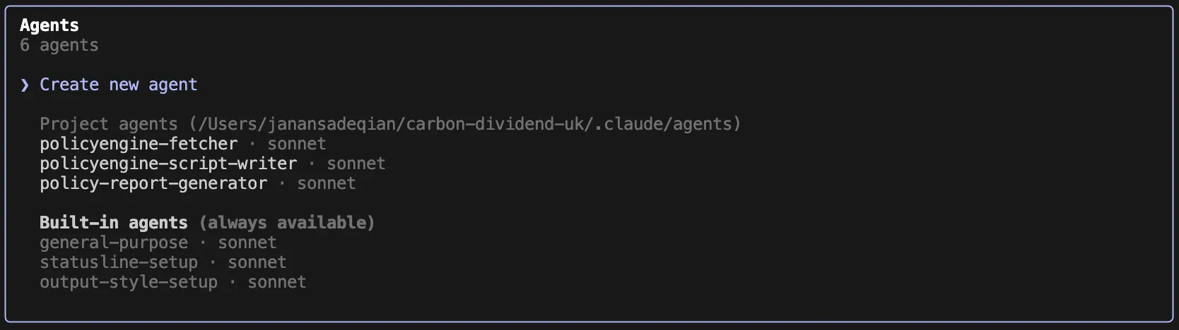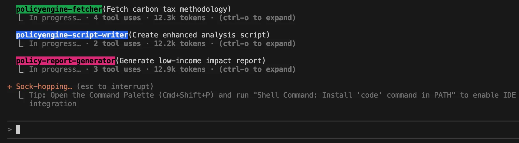 Claude Code automatically routes tasks to the appropriate agent based on the request. When we asked it to analyse a carbon tax scenario, it handled the coordination without explicit instructions about which agent should do what.