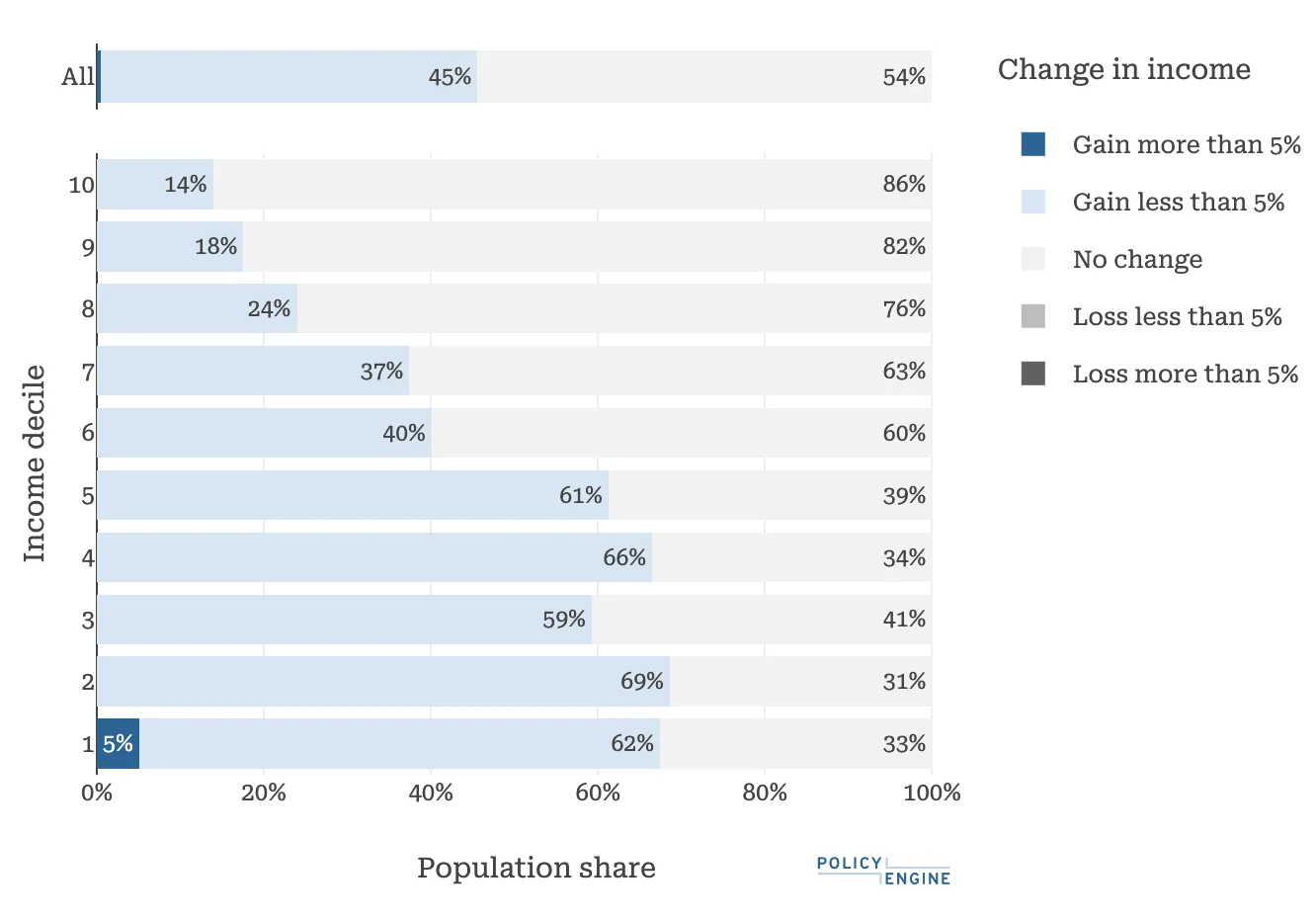 Uprating would benefit around 45% of the population, disproportionately those in the bottom half of the income distribution. 0.5% of the population – entirely in the lowest income decile – would gain at least 5% of their net income.