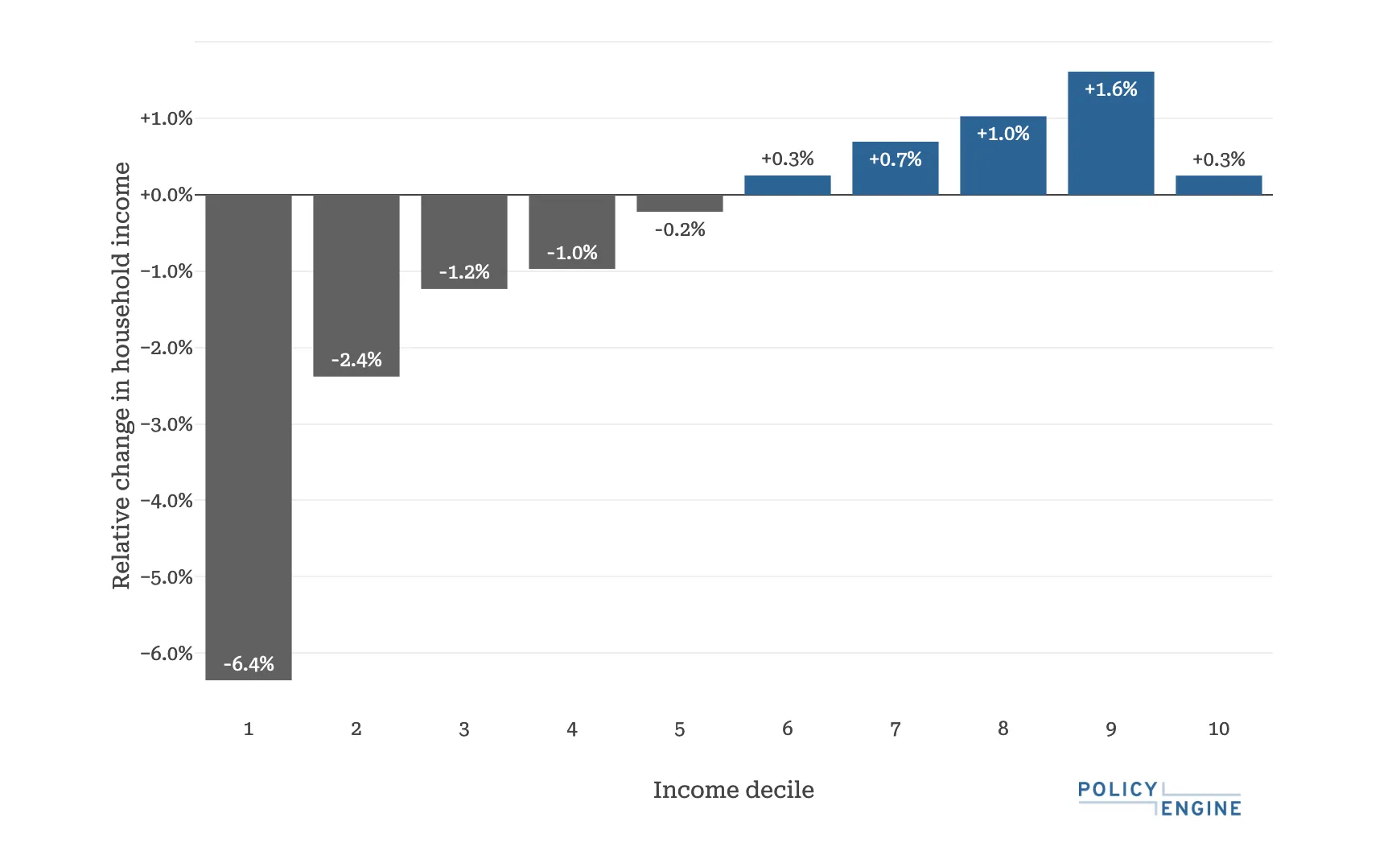 The majority of people in the five lowest income deciles would experience a negative impact on net income while the majority of people in the five highest income deciles would experience a positive net income change.