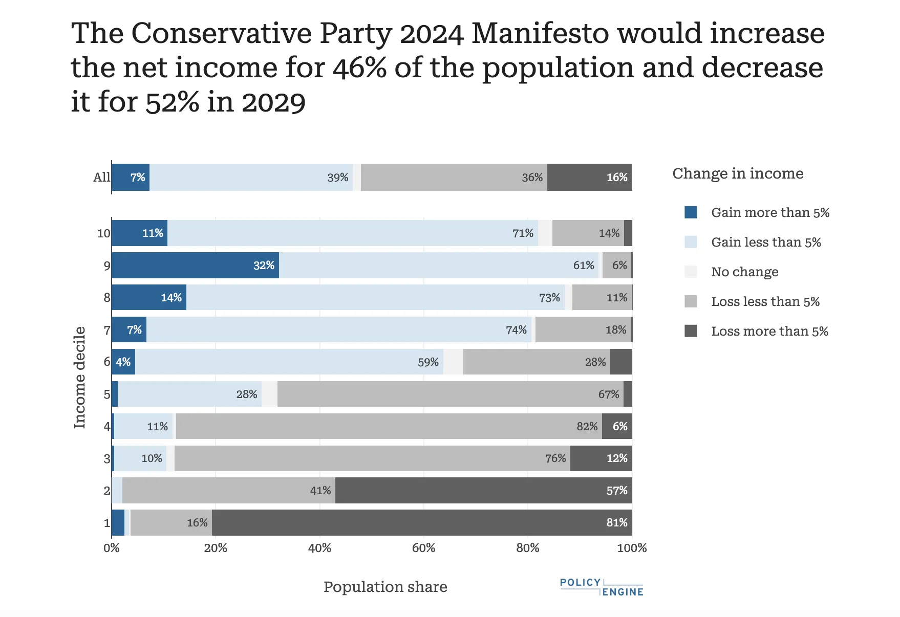 The impacts of the manifesto would largely be regressive. The manifesto reduces disposable income for the bottom ten percent of people by 6.4%.