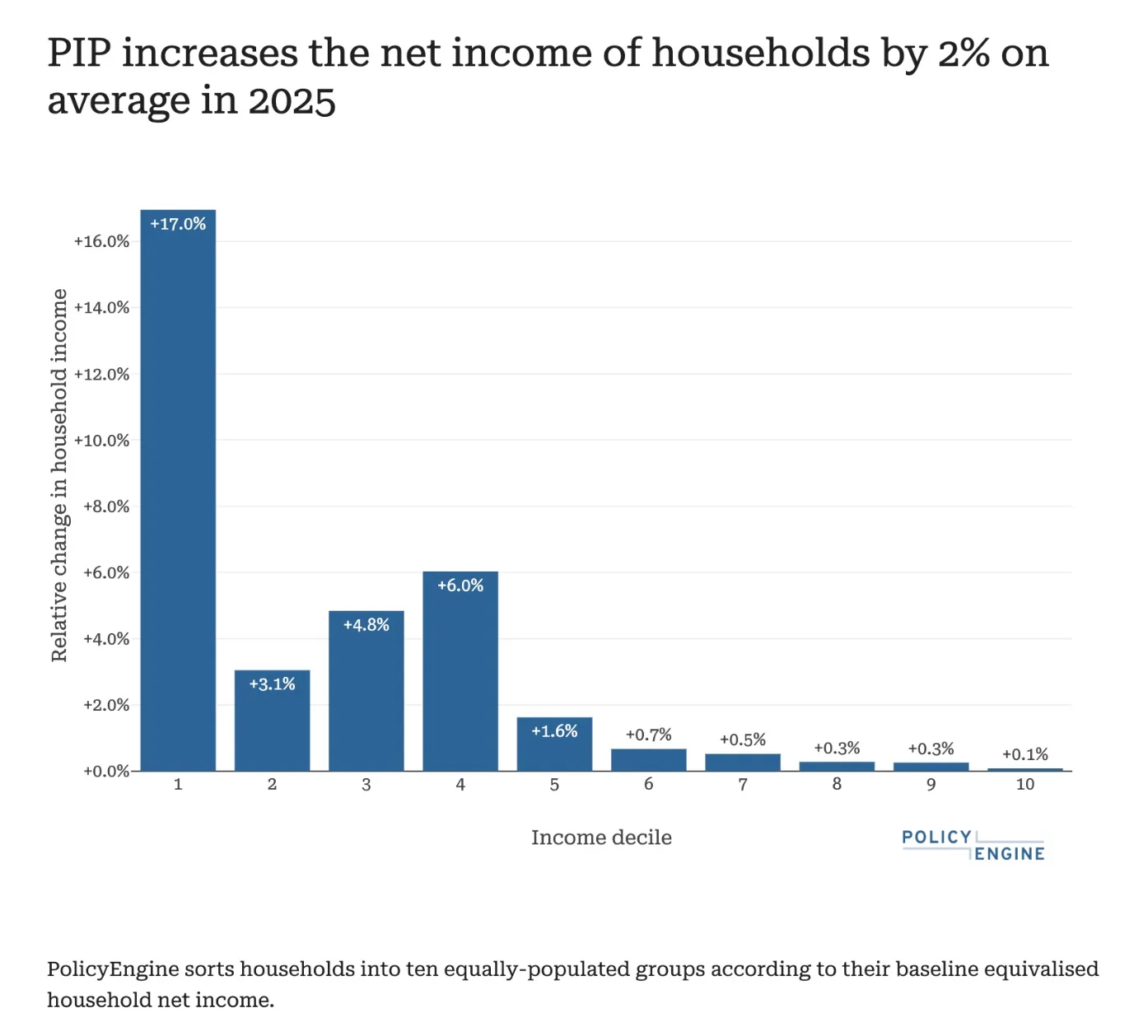 In 2025 and assuming our standard behavioural responses, we estimate that the government will spend £30 billion on PIP payments, affecting the household incomes of 10.3% of people. These payments increase the incomes of the bottom half of the income distribution by more than 1%, and increase the income of the lowest income decile by 17%.