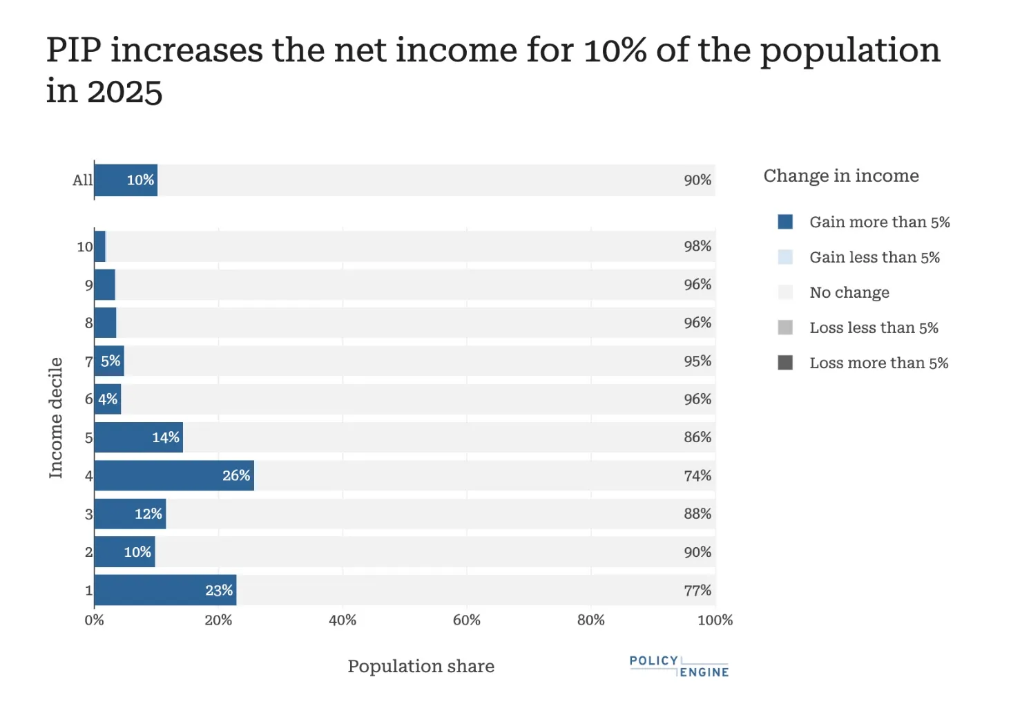 We estimate that PIP increases (by over 5%) the net income for 10% of the population, and around 23% of the lowest income decile.