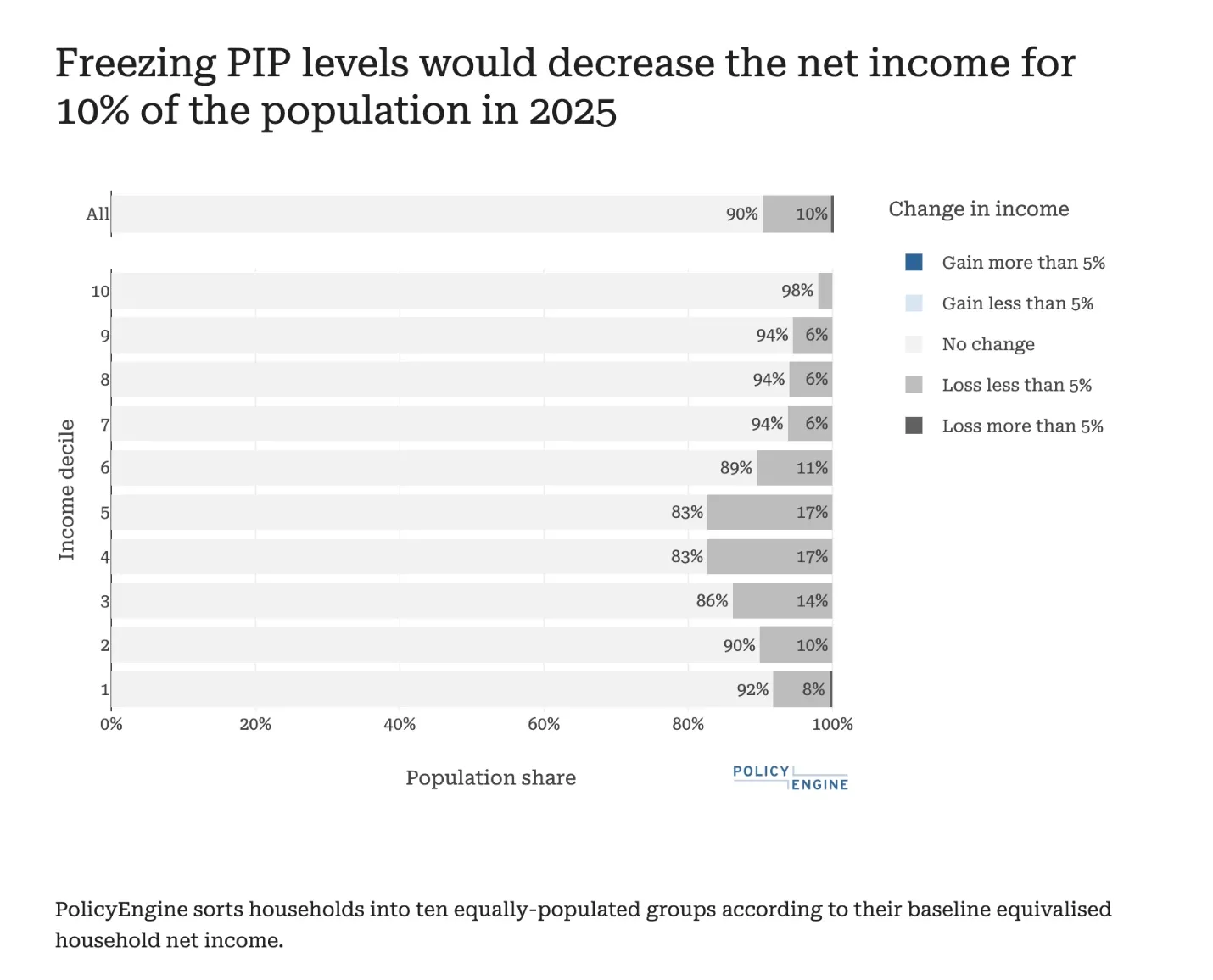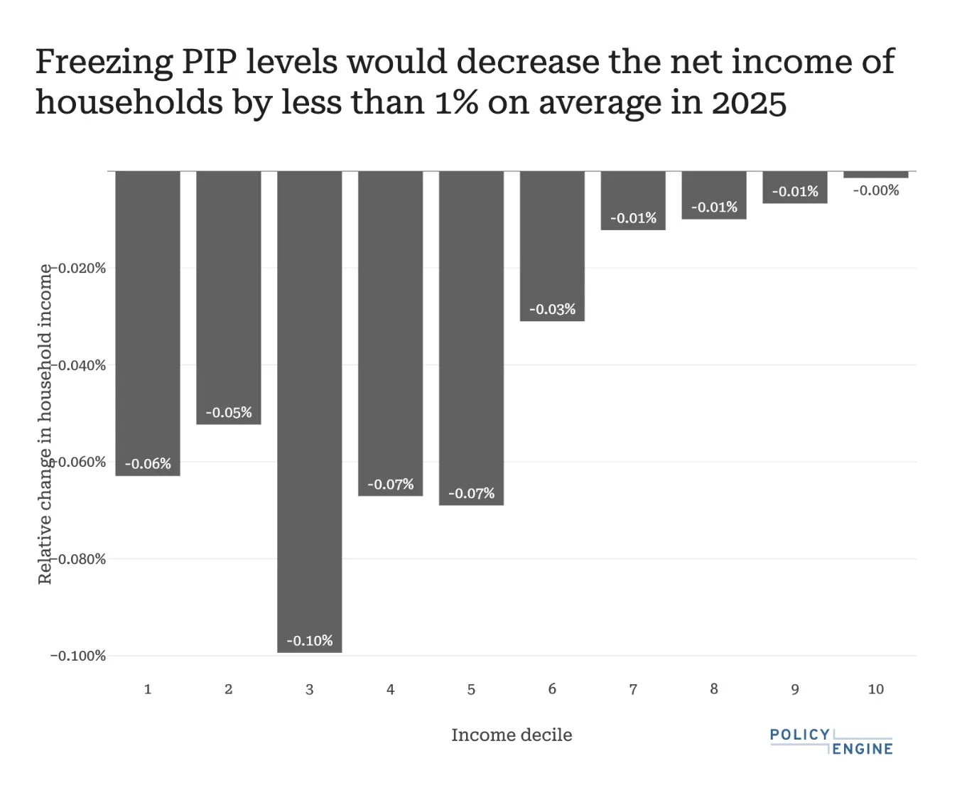 By keeping PIP levels the same in FY 2025/26, PolicyEngine estimates that the government would raise £464 million over that time period. These impacts would affect the household incomes of 9.7% of people and reduce the incomes of the bottom half of the income distribution by between 0.05% and 0.1%.